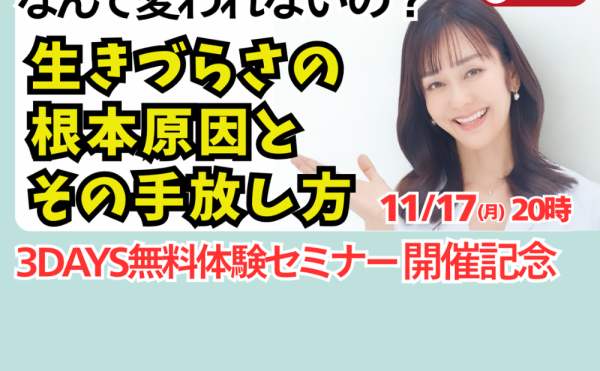 NEW 2025年11月12日お知らせyoshimura 📢11月17日にライブセミナーを開催します生きづらさが良くならない理由ってなに? YouTube LIVEセミナー 開催 今回のLIVEのテーマは、 「生きづらさの根本原因と、その手放し方」 ・人間関係がこじれてしまう本当の理由 ・頑張っても変われなかった“意外 […]